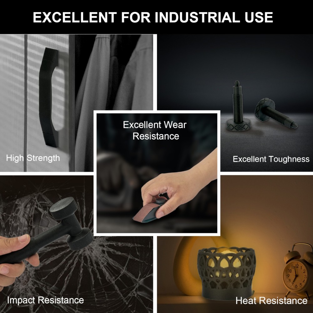 A sua combinação de flexibilidade e resistência ao impacto torna-o ideal para peças funcionais, engrenagens, rolamentos, cabos de ferramentas, componentes mecânicos e protótipos.