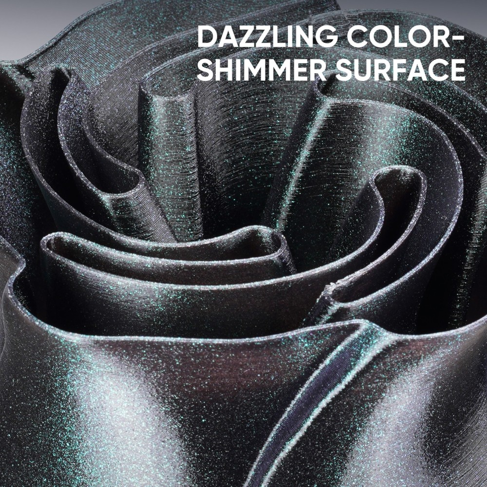 Além disso, o filamento exibe um efeito de mudança de cor reativo à luz, criando gradientes iridescentes que variam com o ângulo de visualização, adicionando profundidade visual e dinamismo aos projetos.
