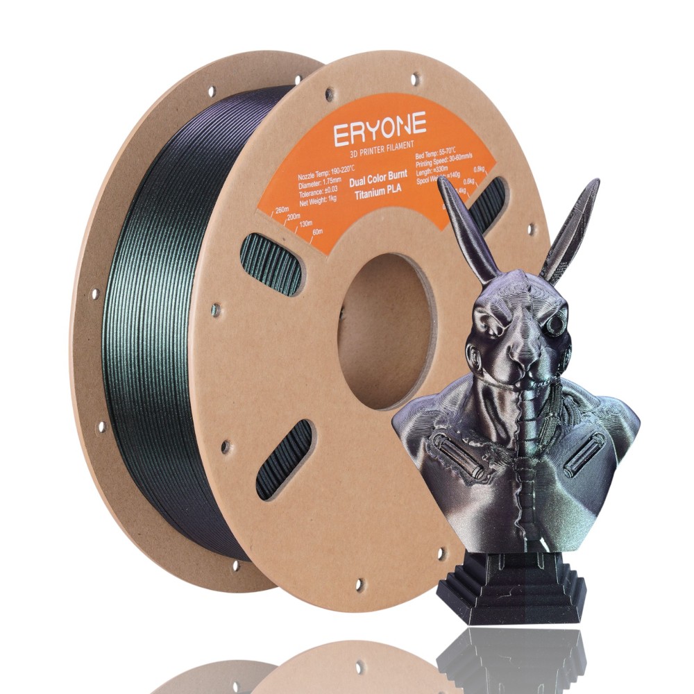 O filamento Eryone Burnt Titanium PLA oferece mudanças de cor cativantes, visíveis sob diferentes iluminações e ângulos, criando uma atmosfera tecnológica única e proporcionando uma experiência visual e tátil excecional.