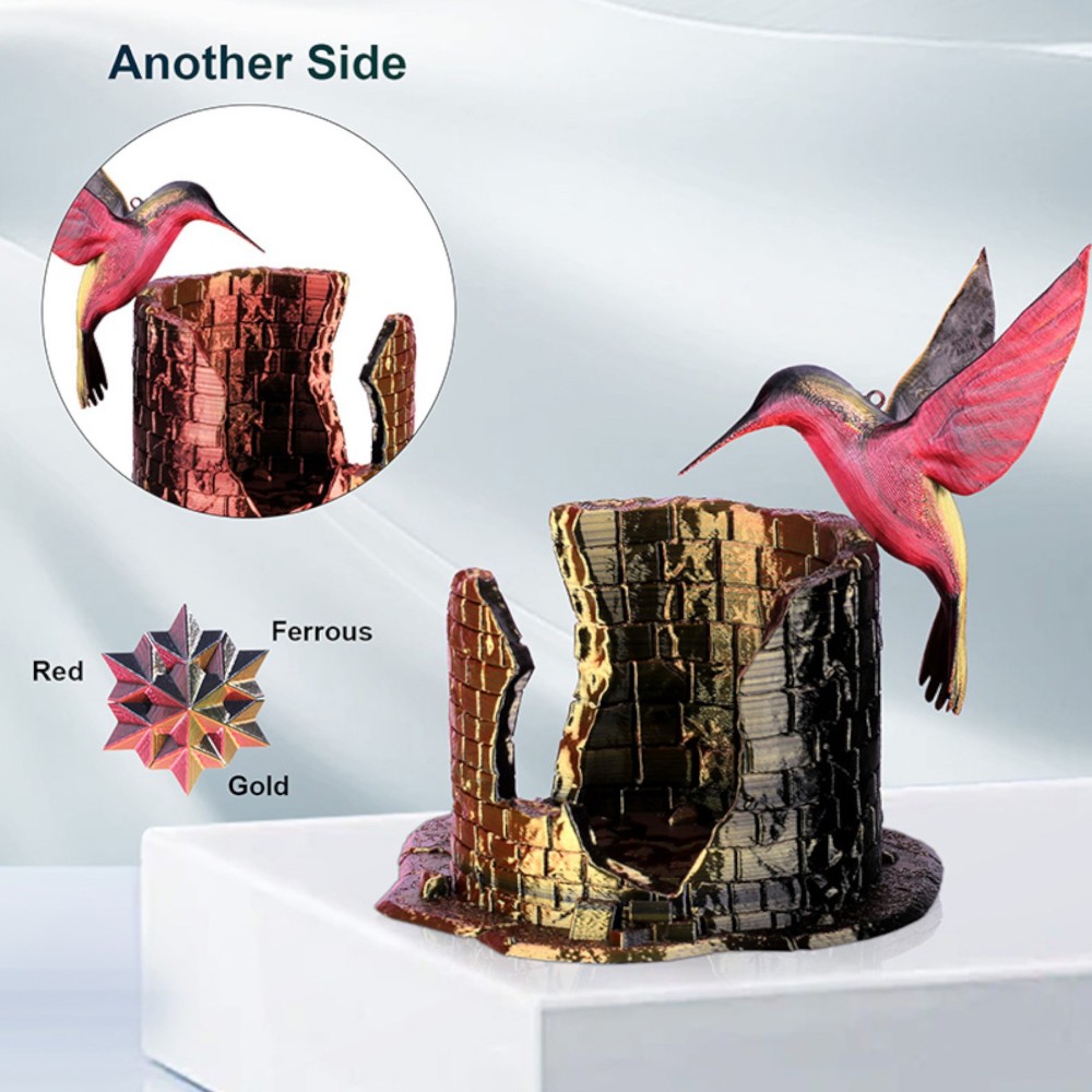 O PLA Matte Gradient Multicolor da ERYONE combina 2 a 3 cores, criando um efeito de gradiente a cada 5 a 8 metros de filamento.
