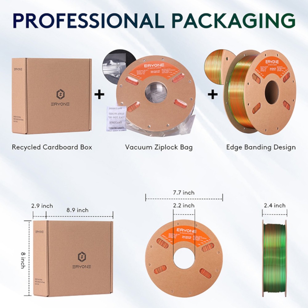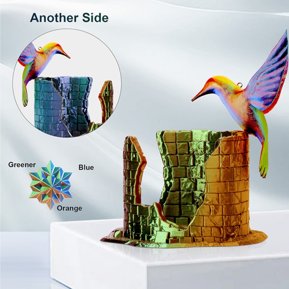 O ERYONE Ultra Silk Twist Rainbow para impressoras 3D é um filamento coextrudido com três cores, criando um efeito visual único. A cada 5 a 8 metros, a cor alterna rapidamente, proporcionando transições marcantes e vibrantes nas impressões.