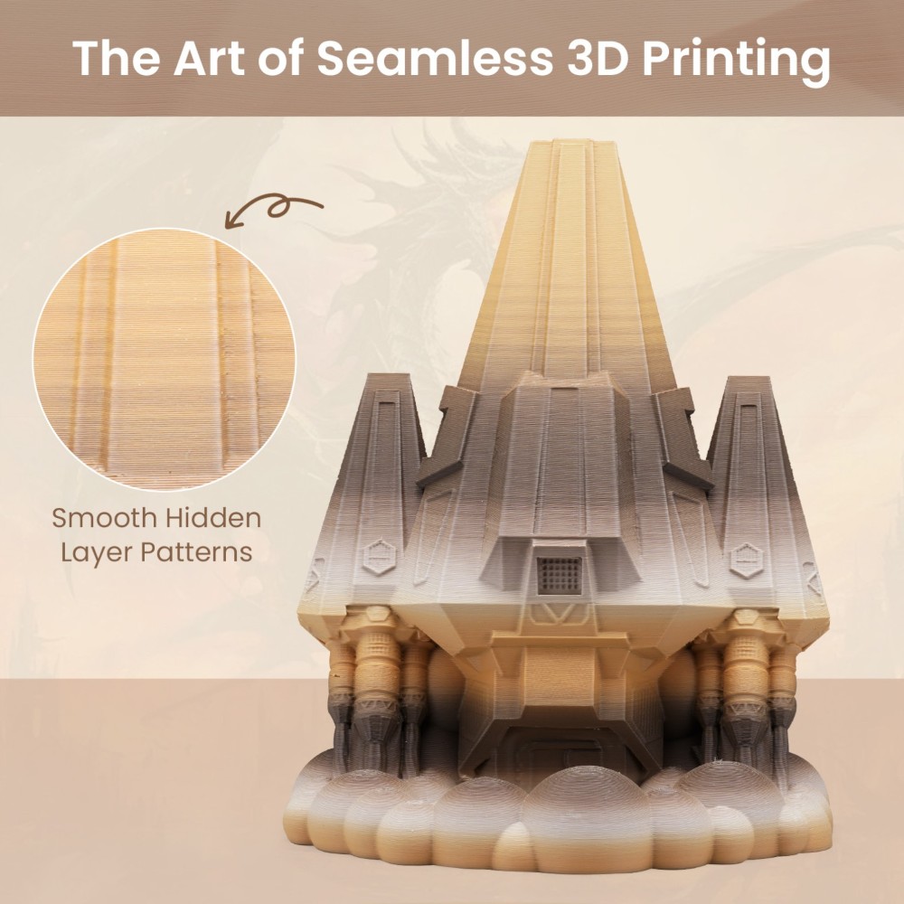 O PLA Matte Gradient Multicolor da ERYONE combina 2 a 3 cores, criando um efeito de gradiente a cada 5 a 8 metros de filamento.