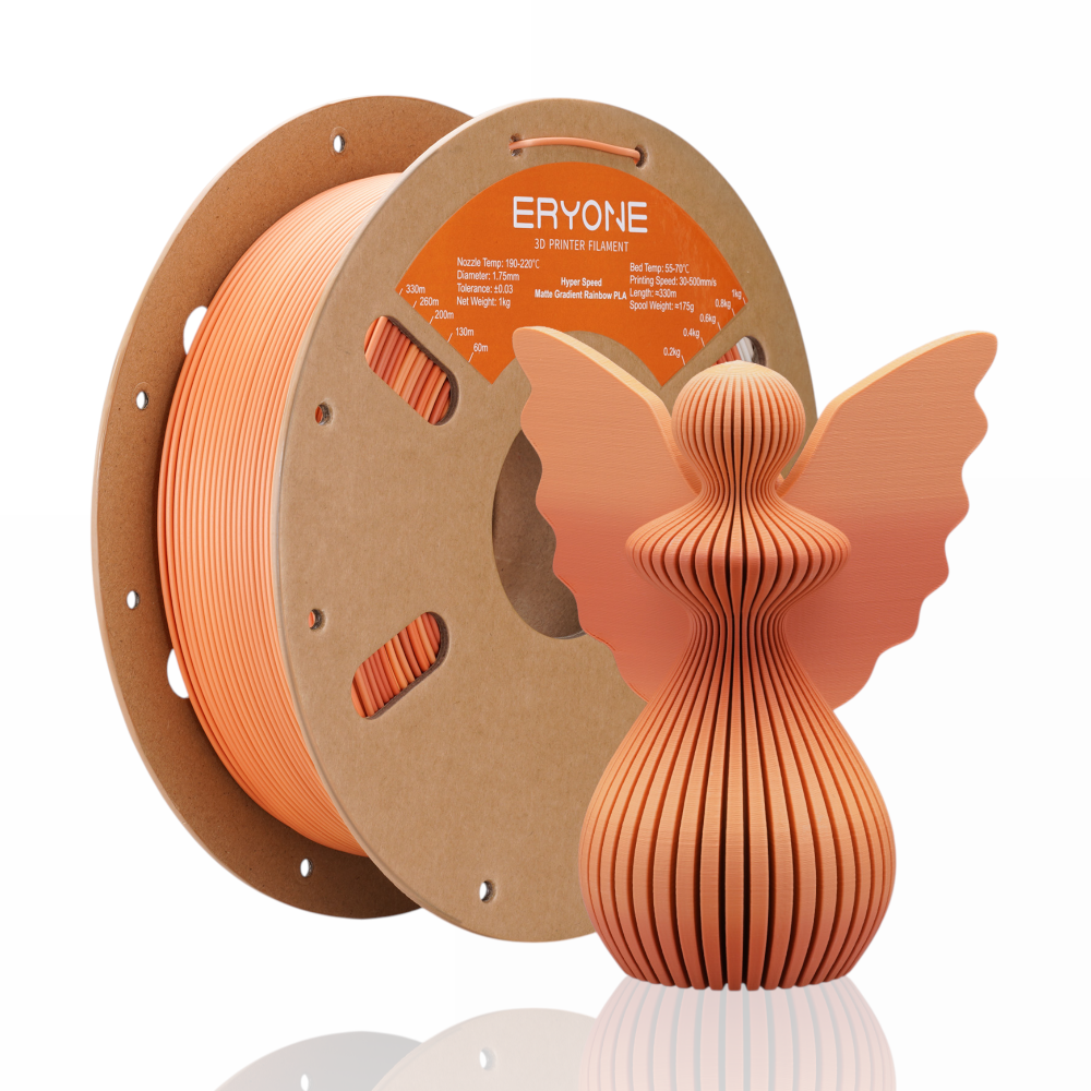O PLA Matte Gradient Multicolor da ERYONE combina 2 a 3 cores, criando um efeito de gradiente a cada 5 a 8 metros de filamento.