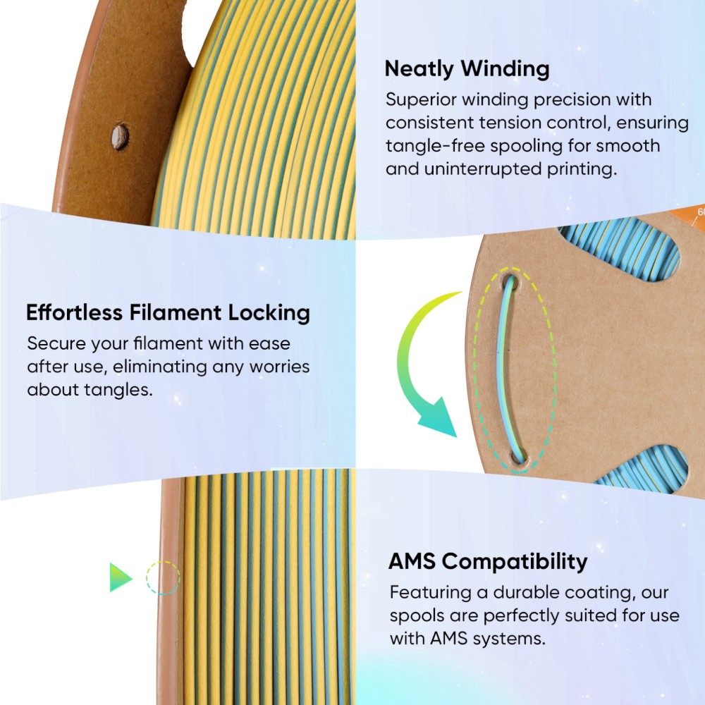 A coextrusão tri-cor cria variações de cor que mudam conforme o ângulo de visualização, dando às peças 3D um aspeto elegante e misterioso — perfeito para projetos artísticos.