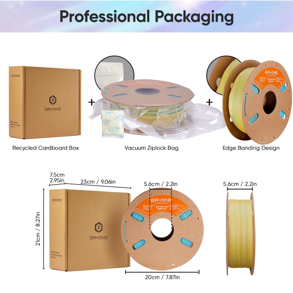 O filamento da ERYONE utiliza coextrusão tri-cor (tons que mudam conforme o ângulo de visualização) e apresenta uma superfície mate. Ideal para impressões 3D decorativas e artísticas que se querem destacar.