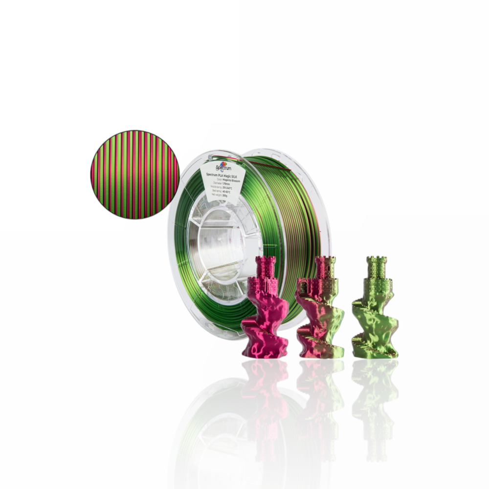 Descobre o poder transformador do Spectrum Magic SILK PLA, um filamento de PLA projetado para elevar a tua impressão 3D a um patamar artístico. Com a sua avançada tecnologia de co-extrusão, este filamento combina duas cores vibrantes numa só tira, criando um efeito óptico fascinante de mudança de cor que varia com a luz e o ângulo de visão. Este efeito não só dá vida aos teus projetos, mas também captura a atenção, tornando cada peça uma exposição de cor e movimento.
