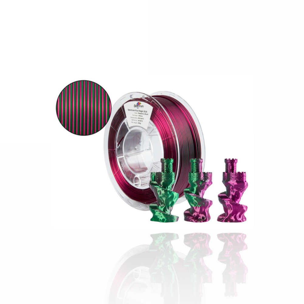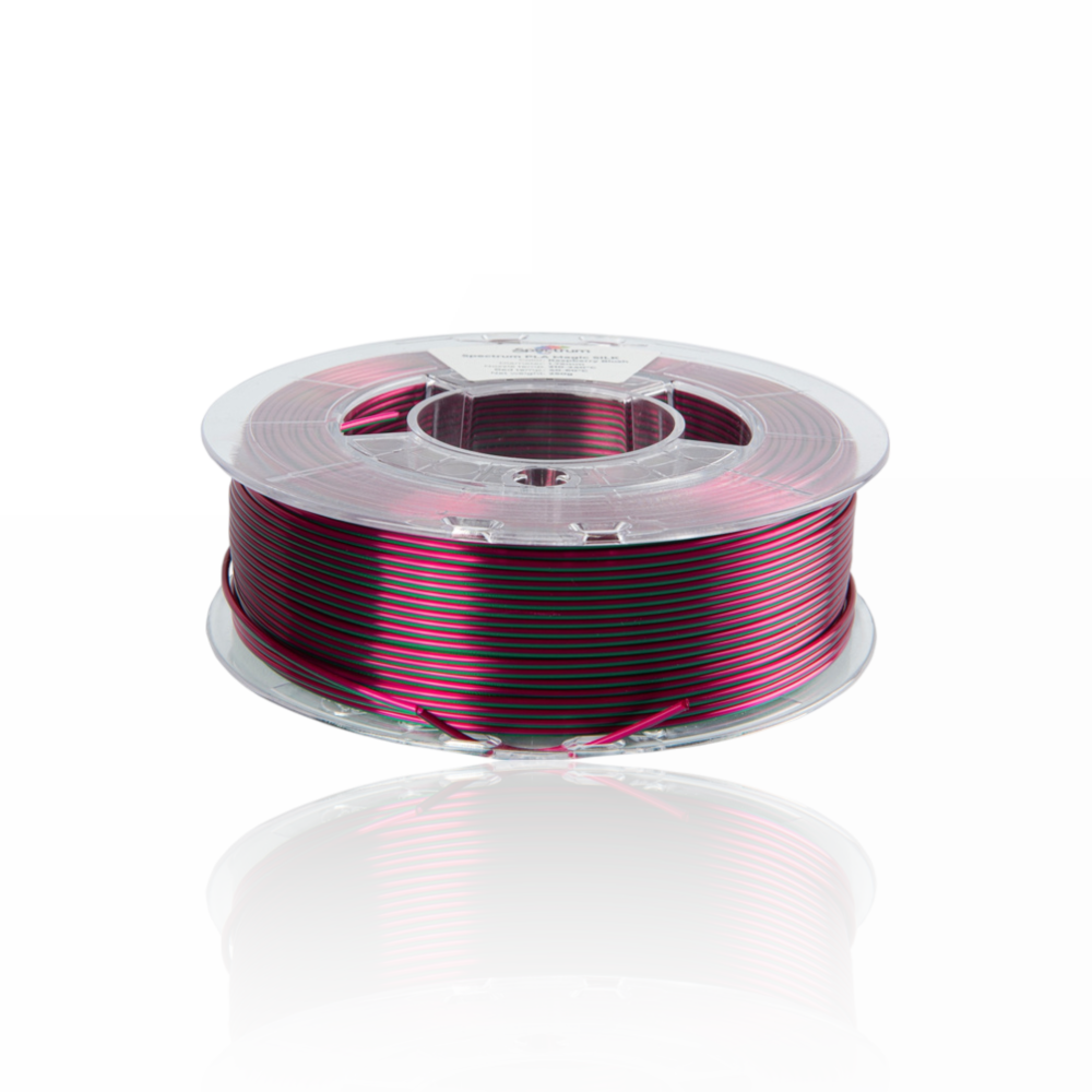 Descobre o poder transformador do Spectrum Magic SILK PLA, um filamento de PLA projetado para elevar a tua impressão 3D a um patamar artístico. Com a sua avançada tecnologia de co-extrusão, este filamento combina duas cores vibrantes numa só tira, criando um efeito óptico fascinante de mudança de cor que varia com a luz e o ângulo de visão. Este efeito não só dá vida aos teus projetos, mas também captura a atenção, tornando cada peça uma exposição de cor e movimento.