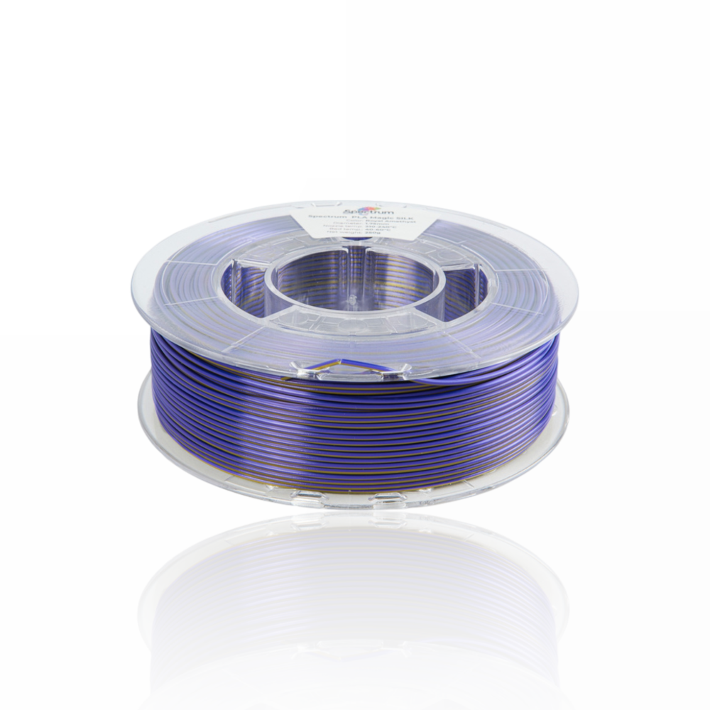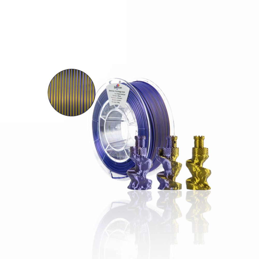 Descobre o poder transformador do Spectrum Magic SILK PLA, um filamento de PLA projetado para elevar a tua impressão 3D a um patamar artístico. Com a sua avançada tecnologia de co-extrusão, este filamento combina duas cores vibrantes numa só tira, criando um efeito óptico fascinante de mudança de cor que varia com a luz e o ângulo de visão. Este efeito não só dá vida aos teus projetos, mas também captura a atenção, tornando cada peça uma exposição de cor e movimento.