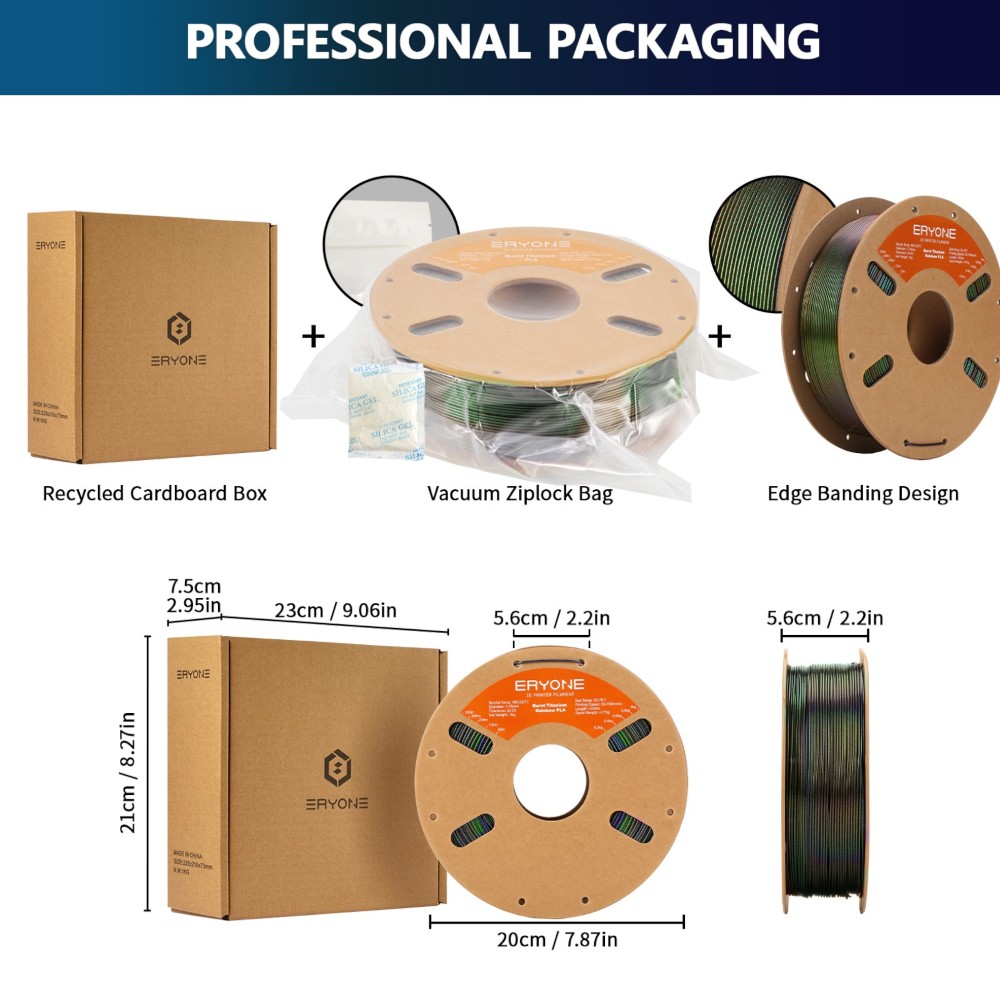 O ERYONE Ultra Silk Twist Rainbow para impressoras 3D é um filamento coextrudido com três cores, criando um efeito visual único. A cada 5 a 8 metros, a cor alterna rapidamente, proporcionando transições marcantes e vibrantes nas impressões.