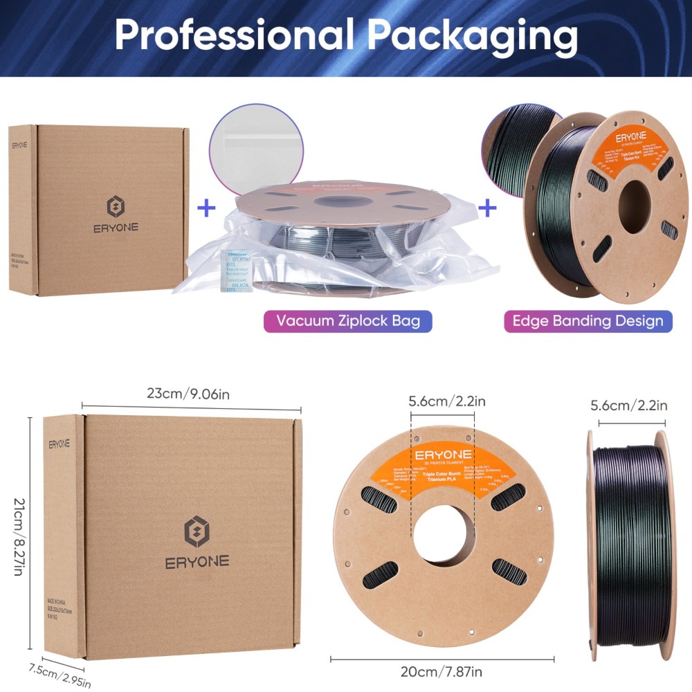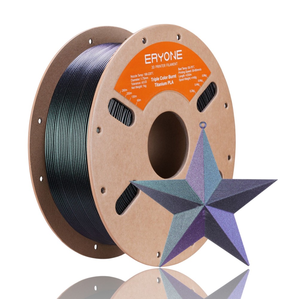 O filamento Eryone Burnt Titanium Triple PLA destaca-se pelas suas mudanças de cor cativantes, visíveis sob diferentes iluminações e ângulos, criando uma atmosfera tecnológica única e oferecendo uma experiência visual e tátil excecional.