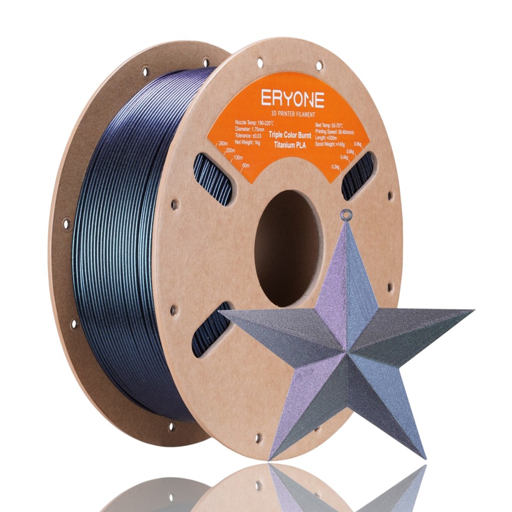 O filamento Eryone Burnt Titanium Triple PLA destaca-se pelas suas mudanças de cor cativantes, visíveis sob diferentes iluminações e ângulos, criando uma atmosfera tecnológica única e oferecendo uma experiência visual e tátil excecional.