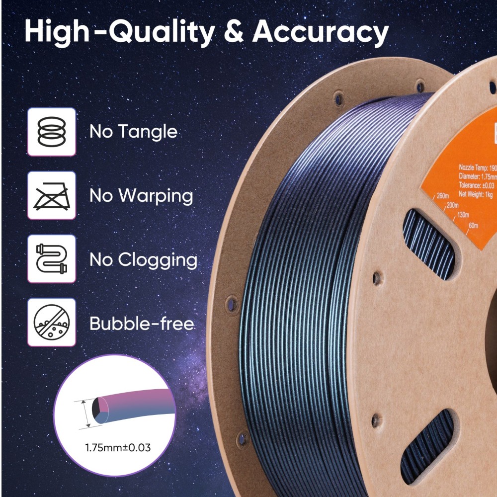 Este filamento oferece profundidade metálica impressionante, que muda de aparência consoante o ângulo, sendo perfeito para armaduras de cosplay, joalharia e modelos de exposição.