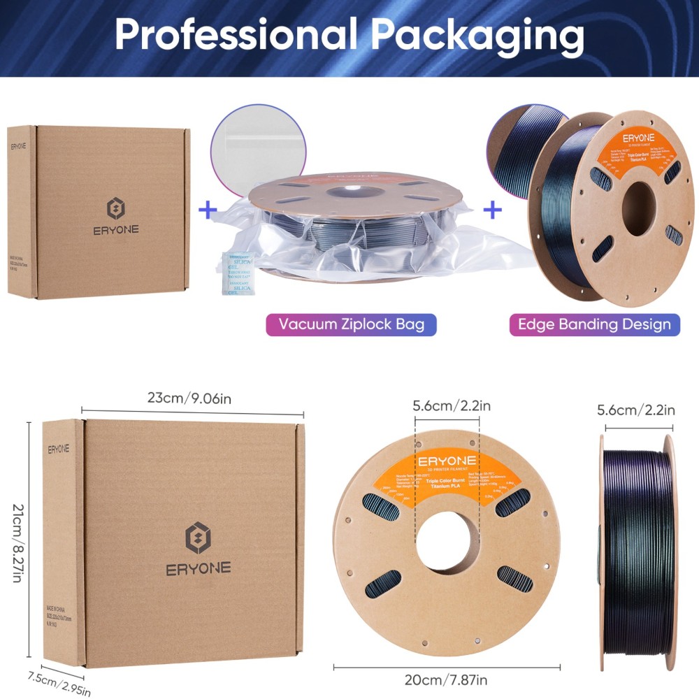 O filamento Eryone Burnt Titanium Triple PLA destaca-se pelas suas mudanças de cor cativantes, visíveis sob diferentes iluminações e ângulos, criando uma atmosfera tecnológica única e oferecendo uma experiência visual e tátil excecional.