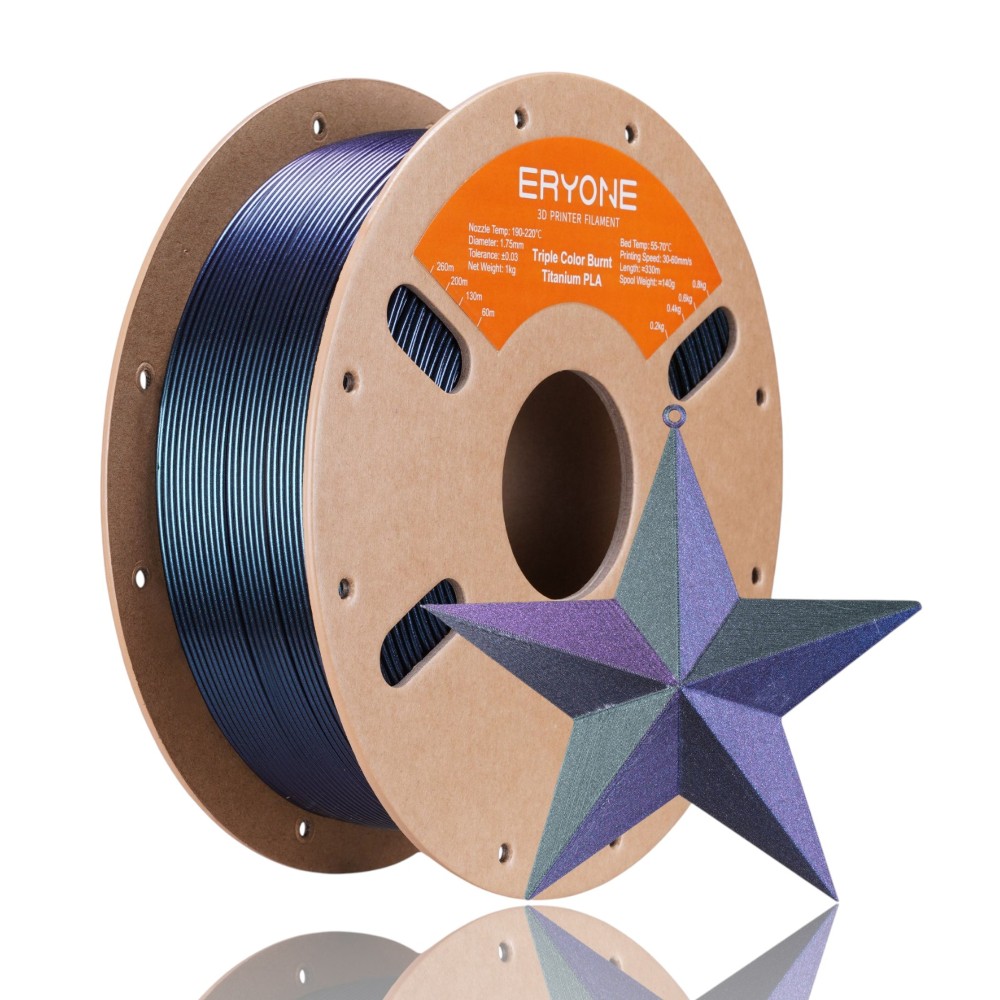 O filamento Eryone Burnt Titanium Triple PLA destaca-se pelas suas mudanças de cor cativantes, visíveis sob diferentes iluminações e ângulos, criando uma atmosfera tecnológica única e oferecendo uma experiência visual e tátil excecional.