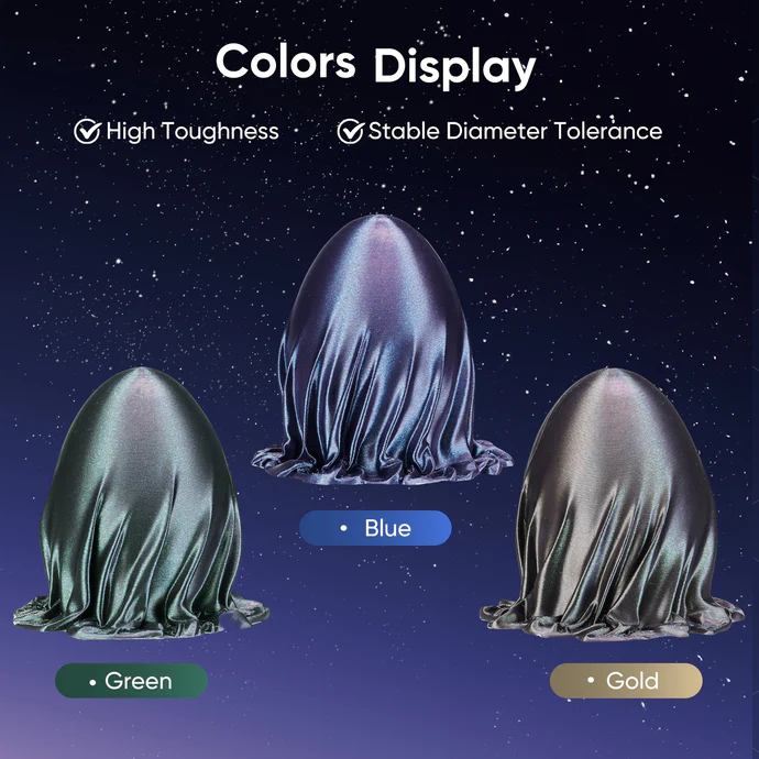 Este filamento oferece profundidade metálica impressionante, que muda de aparência consoante o ângulo, sendo perfeito para armaduras de cosplay, joalharia e modelos de exposição.