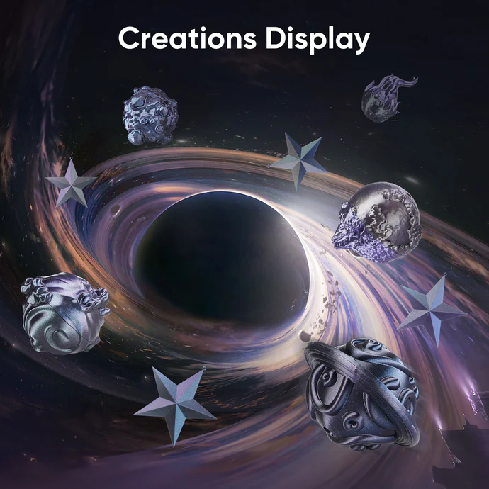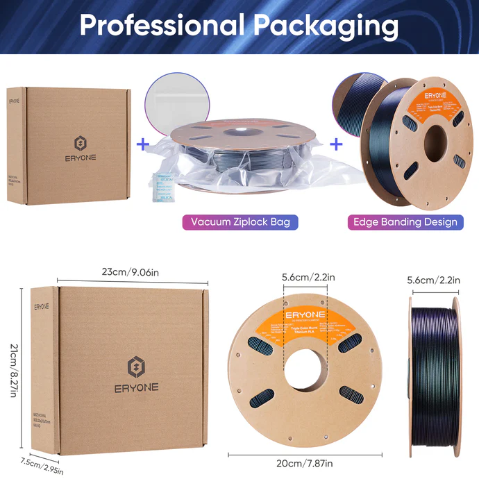O filamento Eryone Burnt Titanium Triple PLA destaca-se pelas suas mudanças de cor cativantes, visíveis sob diferentes iluminações e ângulos, criando uma atmosfera tecnológica única e oferecendo uma experiência visual e tátil excecional.