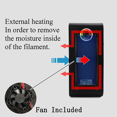 • Com aquecedor PTC de 45W que é mais durável, economizador de energia, e amigo do ambiente, torna a secagem do filamento mais uniforme. Também um ventilador incorporado é concebido para fazer circular o ar quente dentro da caixa do secador de filamentos para que o sistema de secagem remova melhor a humidade.