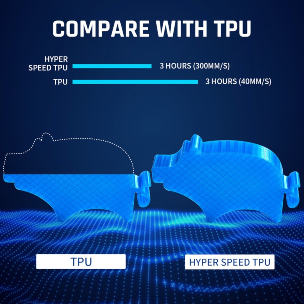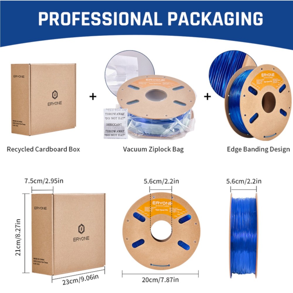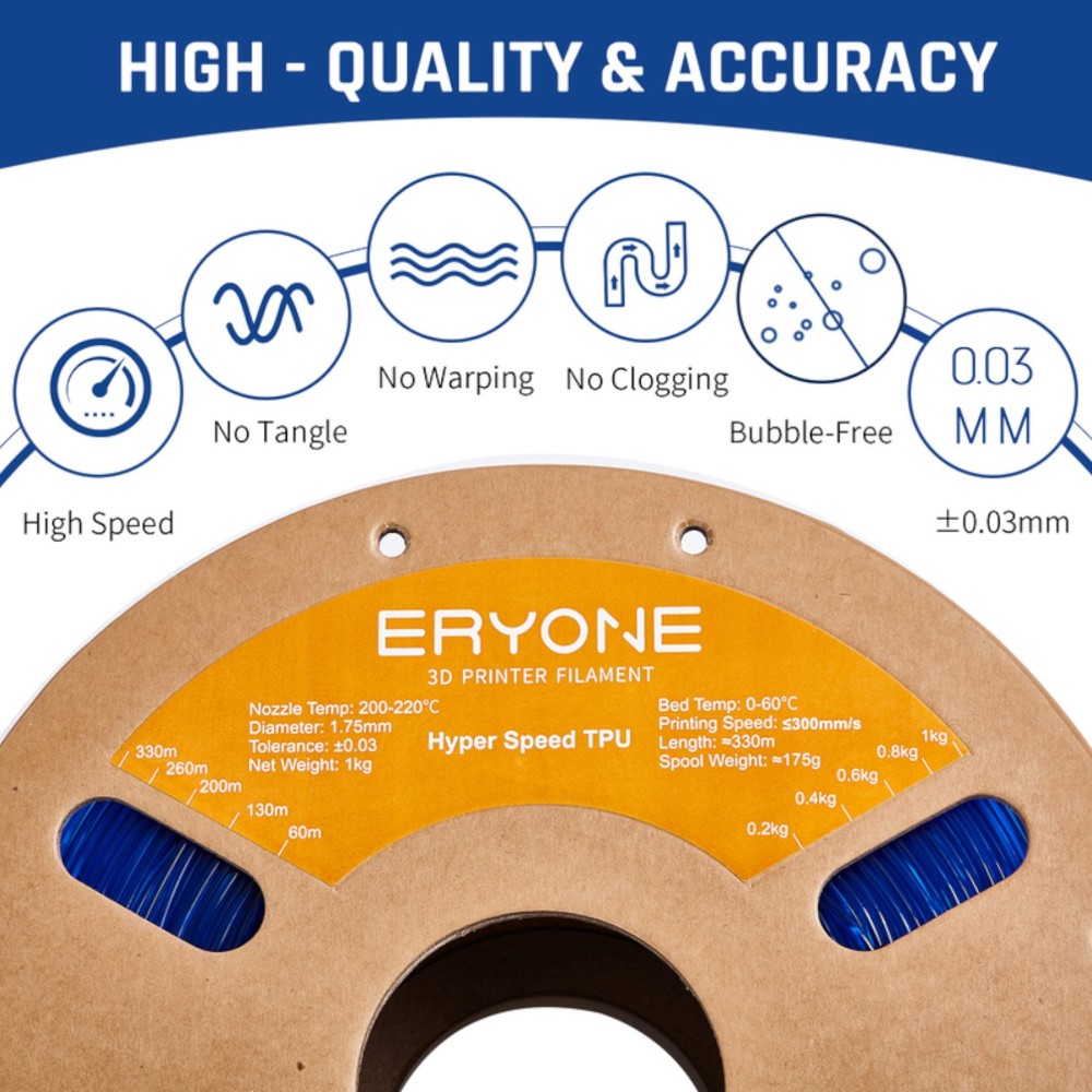 O filamento ERYONE TPU 1.75mm foi desenvolvido para impressão em alta velocidade, alcançando 30–300 mm/s, até 5 vezes mais rápido do que o TPU tradicional, proporcionando uma experiência de impressão 3D suave e eficiente.