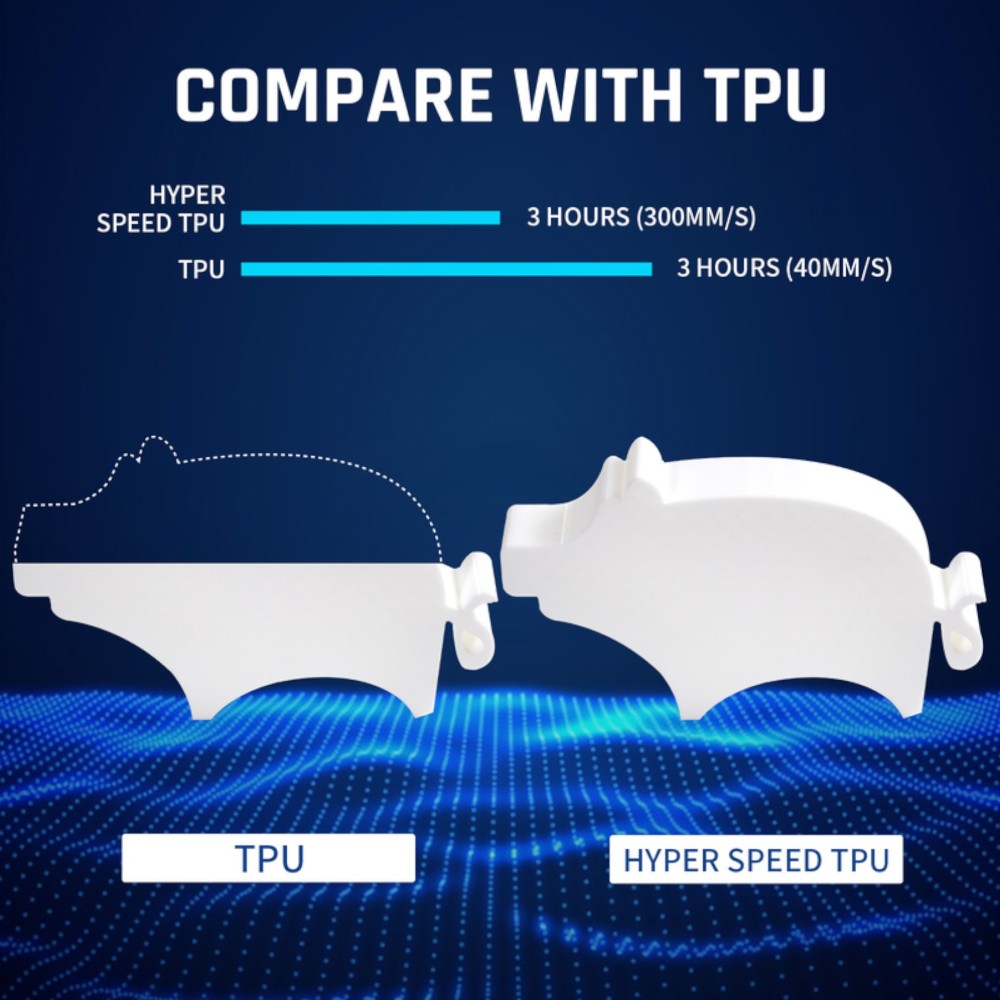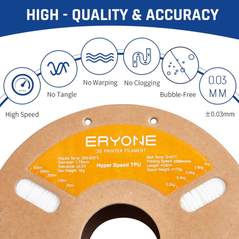 O filamento ERYONE TPU 1.75mm foi desenvolvido para impressão em alta velocidade, alcançando 30–300 mm/s, até 5 vezes mais rápido do que o TPU tradicional, proporcionando uma experiência de impressão 3D suave e eficiente.